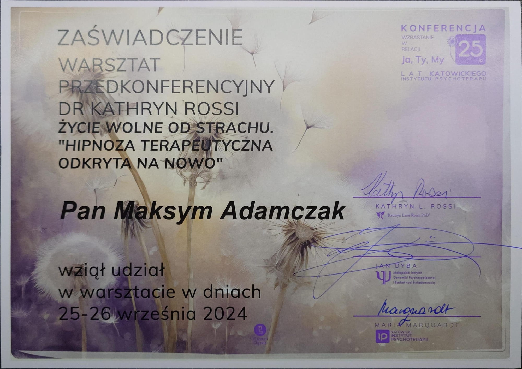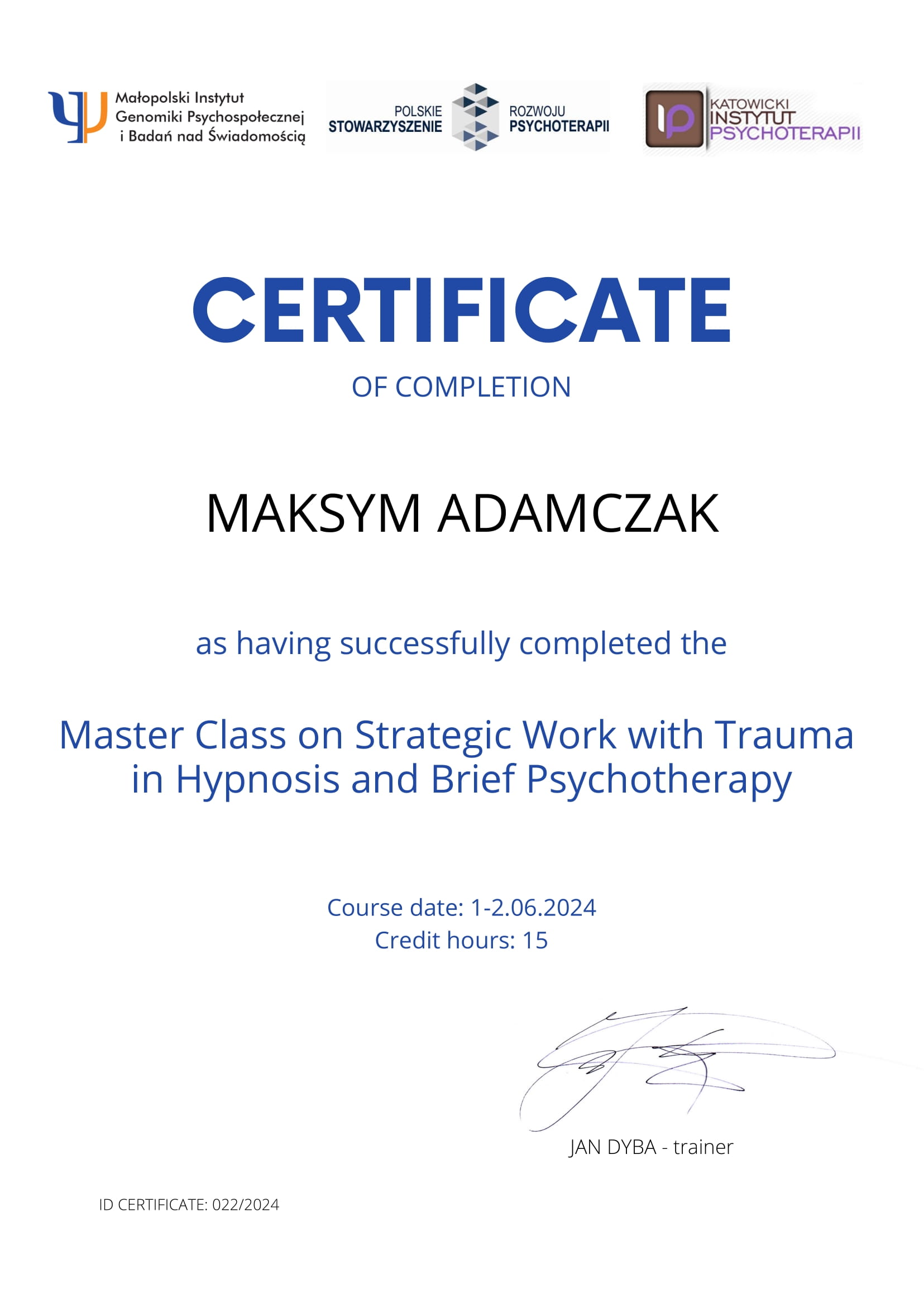 - „Master Class on Strategic Work with Trauma in Hypnosis and Brief Psychotherapy” (15h), mgr Jan Dyba, Małopolski Instytut Genomiki Psychospołecznej i Badań nad Świadomością, 2024 r.