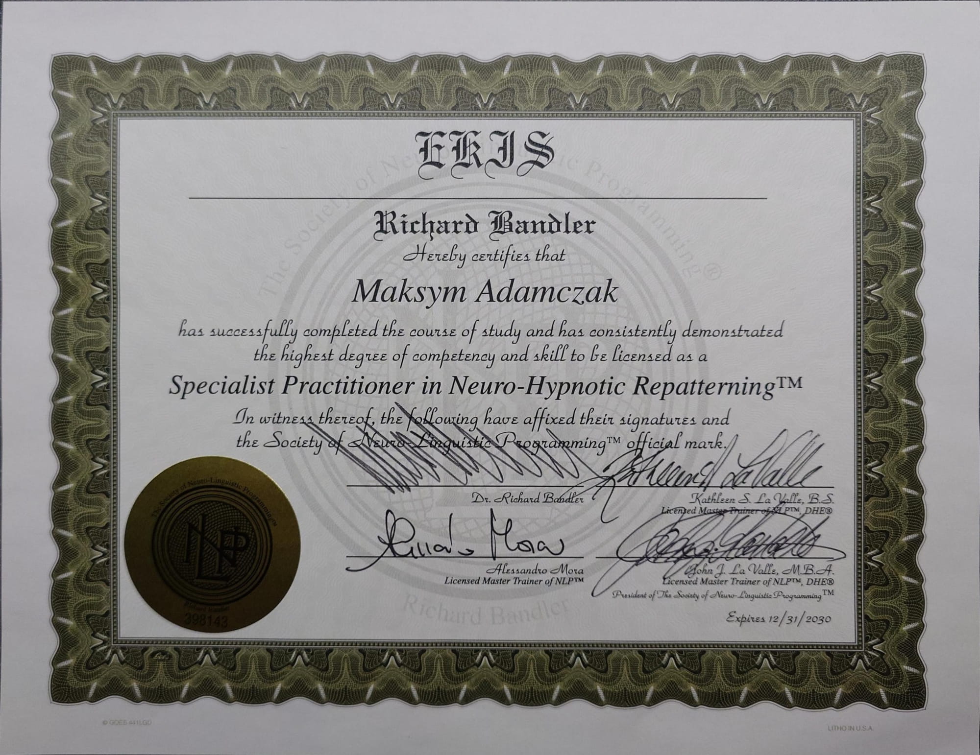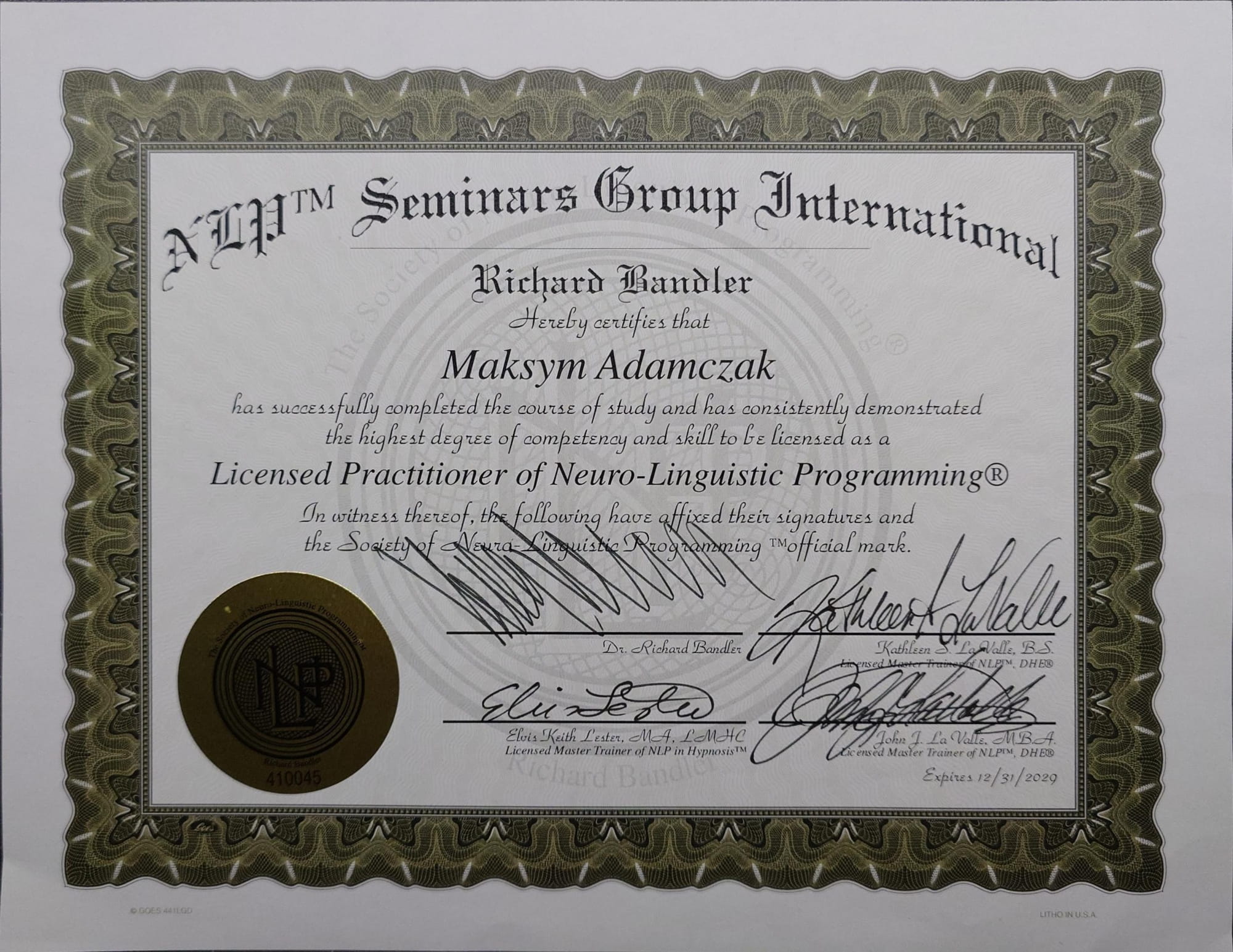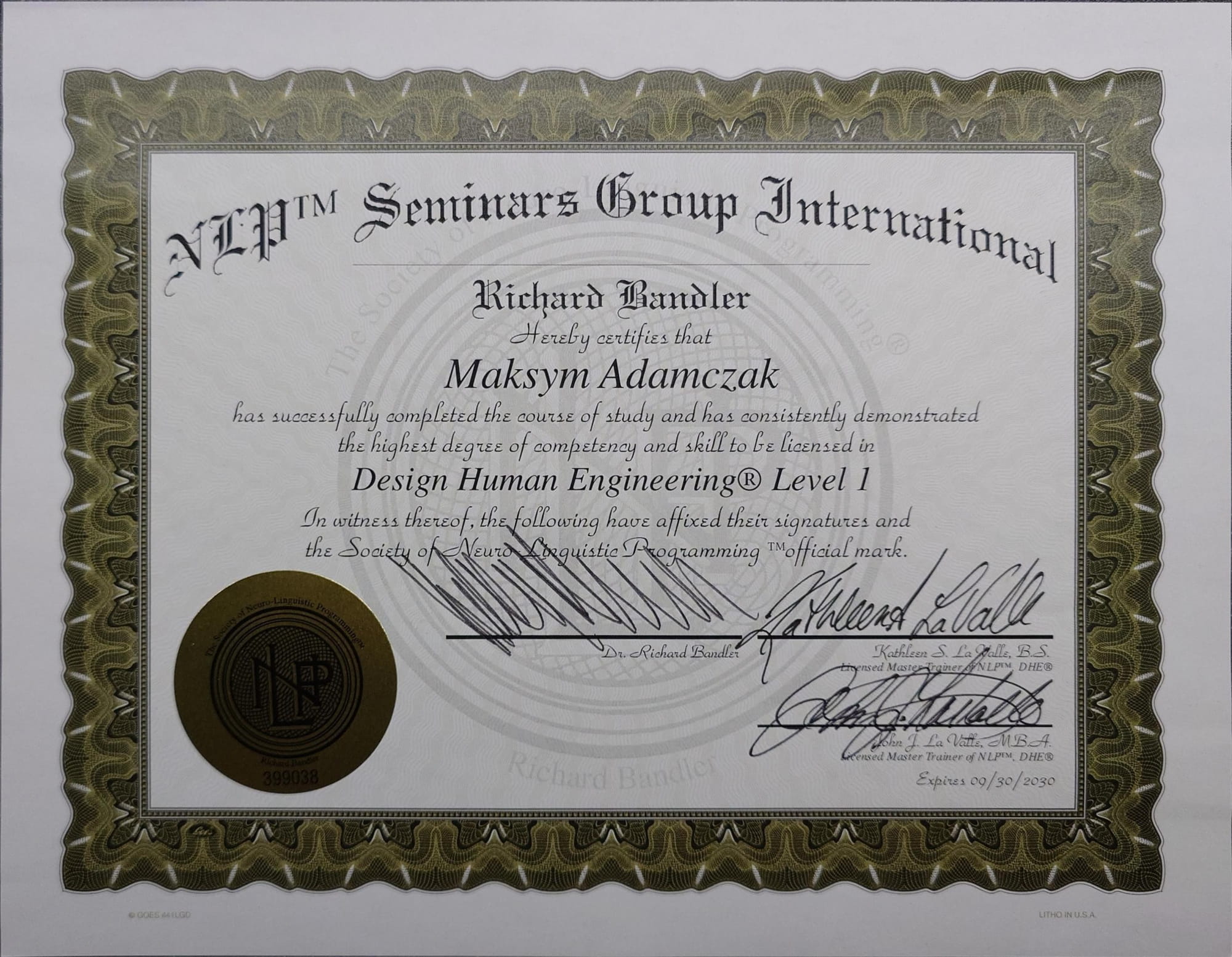 - „Licensed Practitioner of Neuro-Linguistic Programming” dr Richard Bandler, NLP Seminars Group International, Orlando Floryda, 2024 r.
