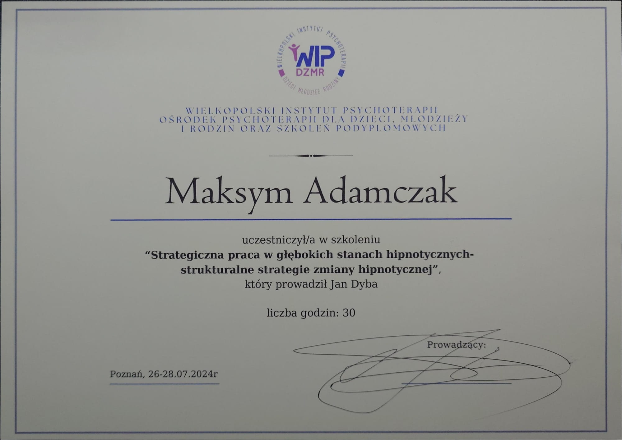 - „Strategiczna praca w głębokich stanach hipnotycznych – strukturalne strategie zmiany hipnotycznej” (30h), mgr Jan Dyba, Wielkopolski Instytut Psychoterapii DZMR, 2024 r.