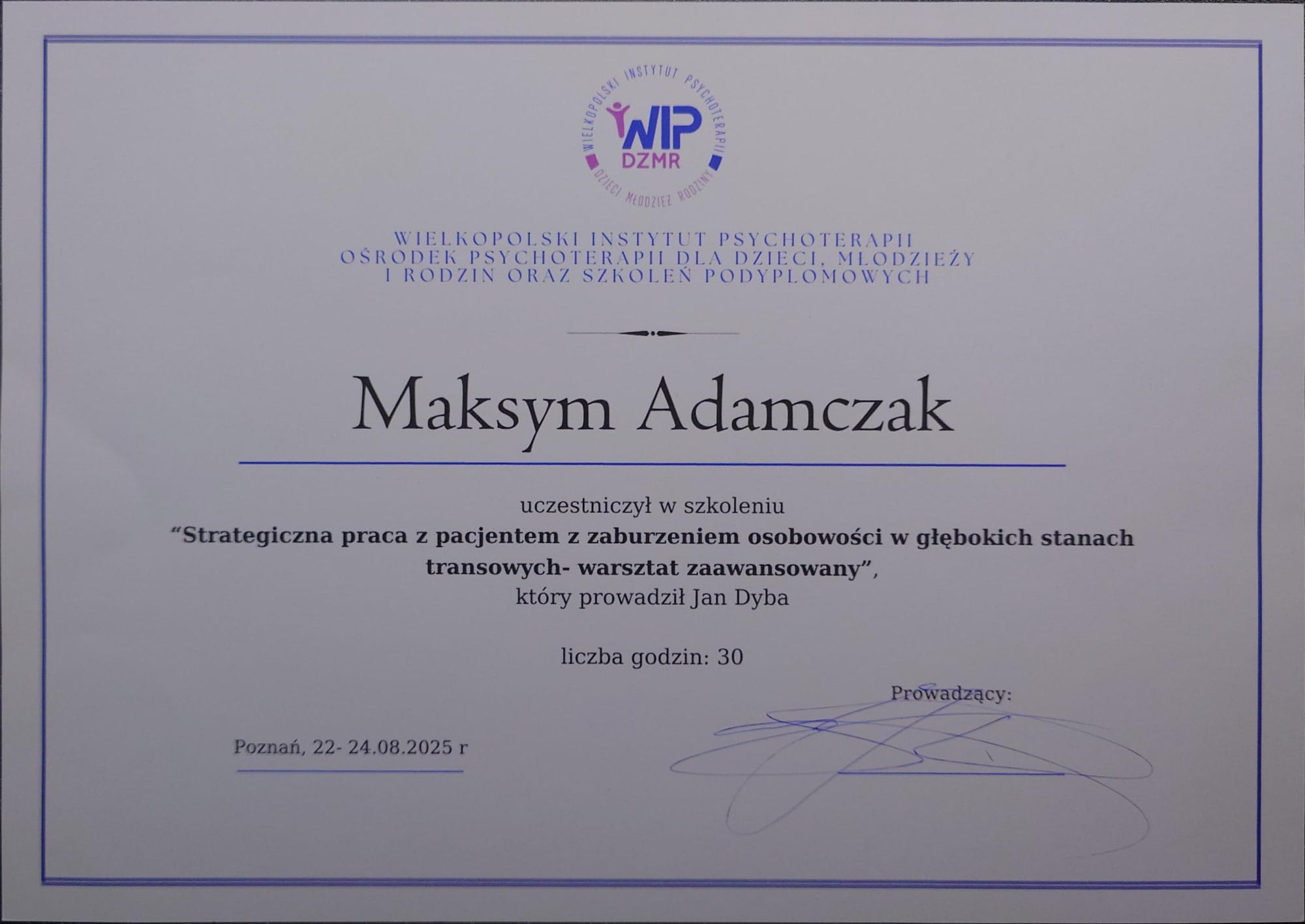 - „Strategiczna praca z pacjentem z zaburzeniem osobowości w głębokich stanach transowych – warsztat zaawansowany” (30h), mgr Jan Dyba, Wielkopolski Instytut Psychoterapii DZMR, 2025 r.