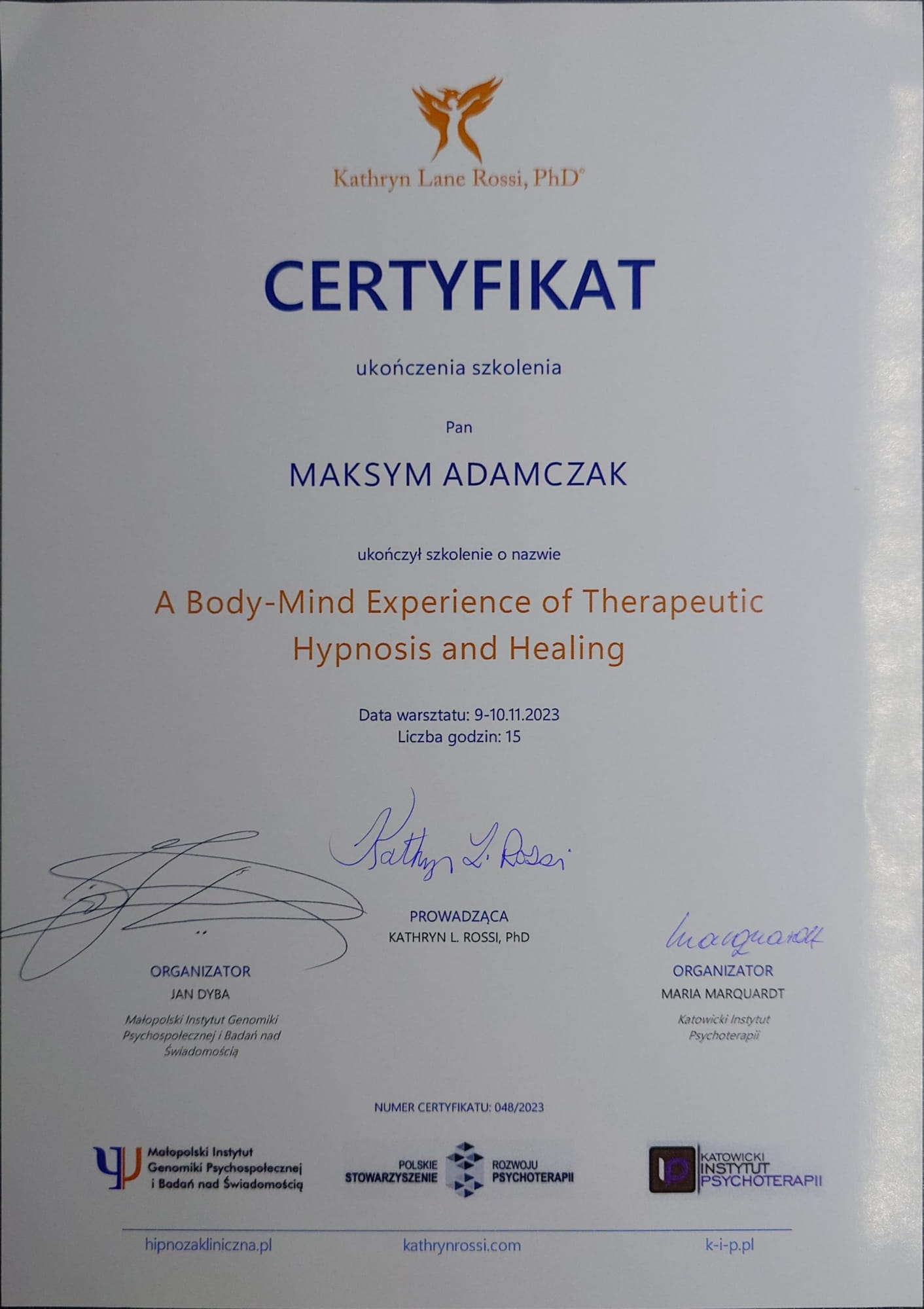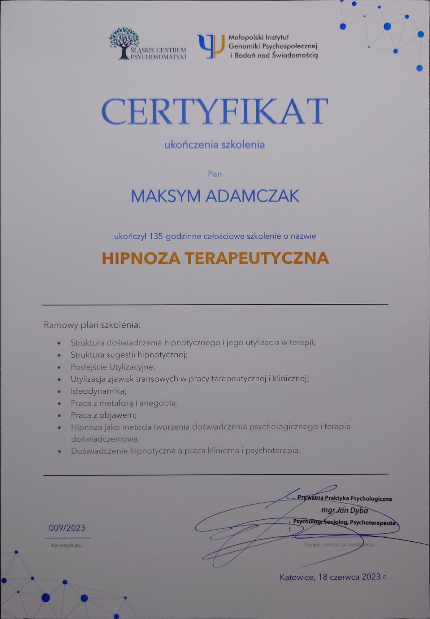 - Całościowe szkolenie „Hipnoza terapeutyczna” (135h), mgr Jan Dyba, Małopolski Instytut Genomiki Psychospołecznej i Badań nad Świadomością, 2023 r.