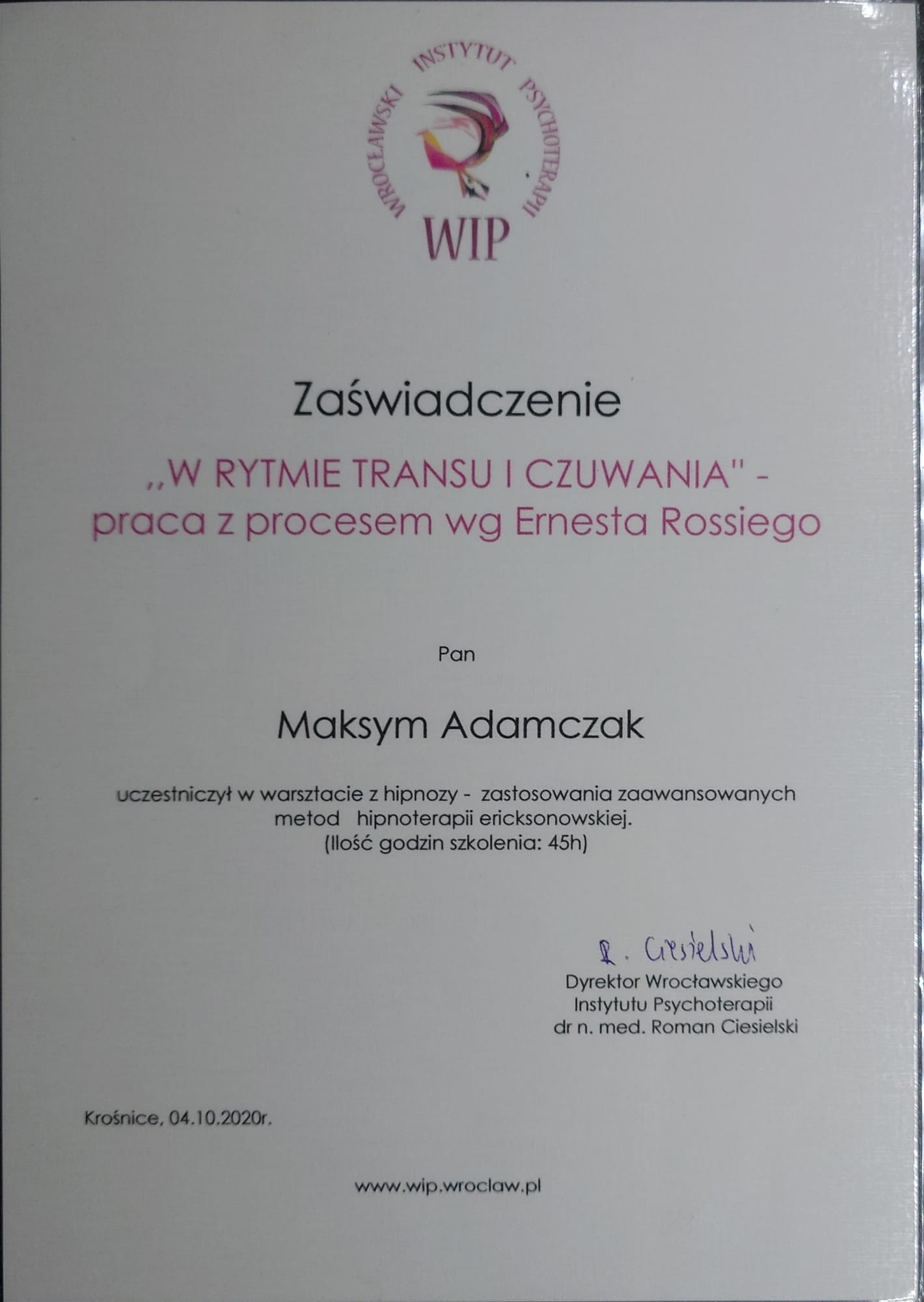 - „W rytmie transu i czuwania – praca z procesem wg Ernesta Rossiego” (45h), dr Roman Ciesielski, Wrocławski Instytut Psychoterapii, 2020 r.