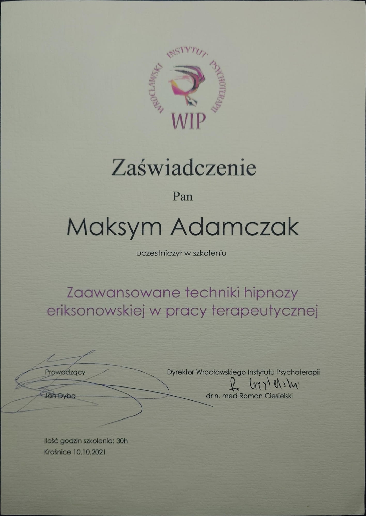 - „Zaawansowane techniki hipnozy ericksonowskiej w pracy terapeutycznej” (30h), mgr Jan Dyba, Wrocławski Instytut Psychoterapii, 2021 r.