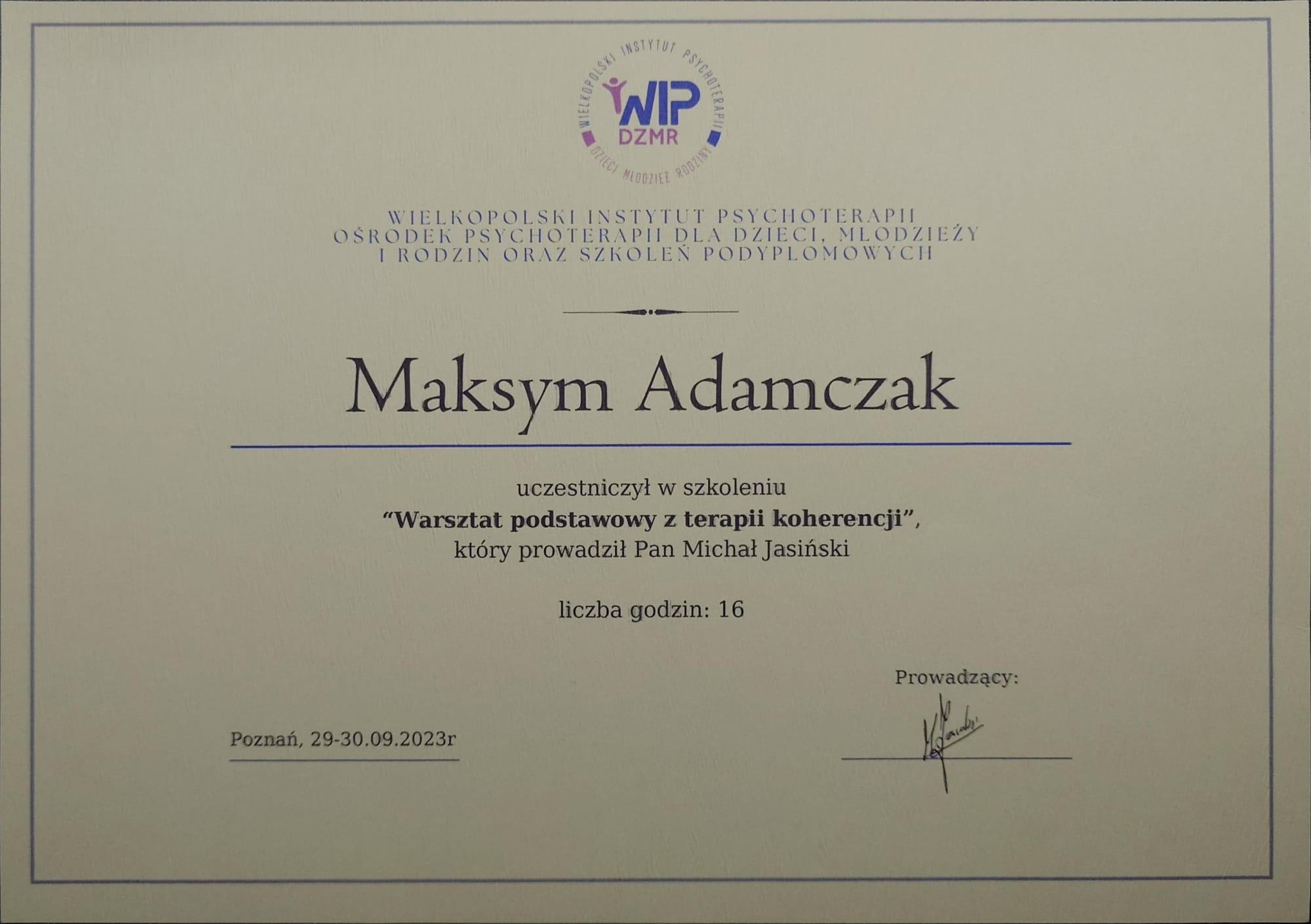 - Warsztat podstawowy z terapii koherencji (16h), dr Michał Jasiński, Wielkopolski Instytut Psychoterapii DZMR, 2023 r.