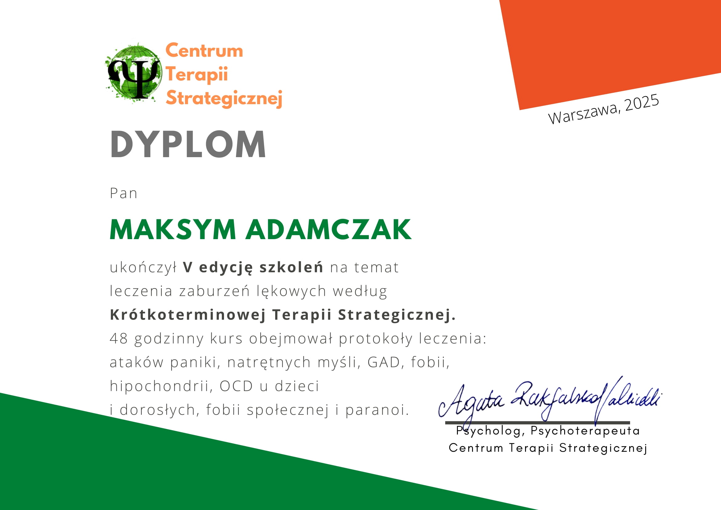 - „Szkolenie na temat diagnozy i leczenia depresji w nurcie Krótkoterminowej Terapii Strategicznej” (8h), mgr Agata Rakfalska-Vallicelli, Centrum Terapii Strategicznej, Warszawa, 2025 r.