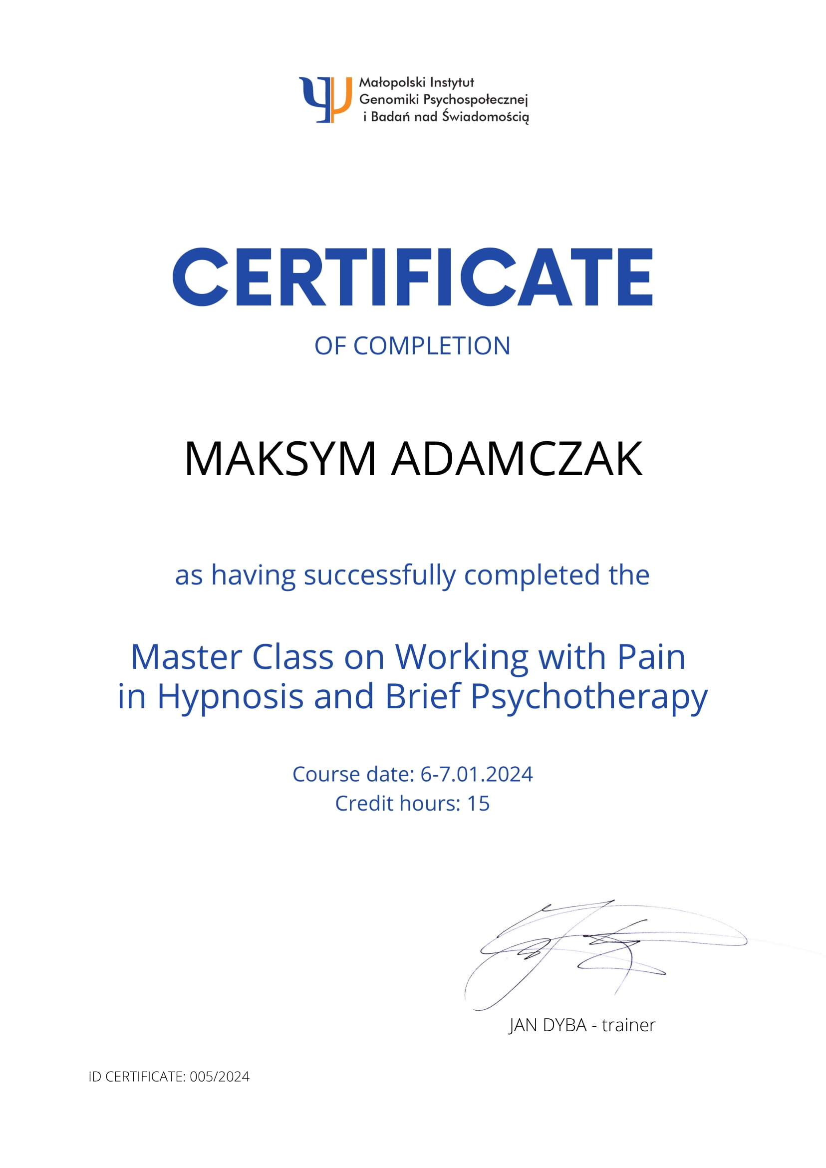 - „Master Class on Working with Pain in Hypnosis and Brief Psychotherapy”(15h), mgr Jan Dyba, Małopolski Instytut Genomiki Psychospołecznej i Badań nad Świadomością, 2024 r.