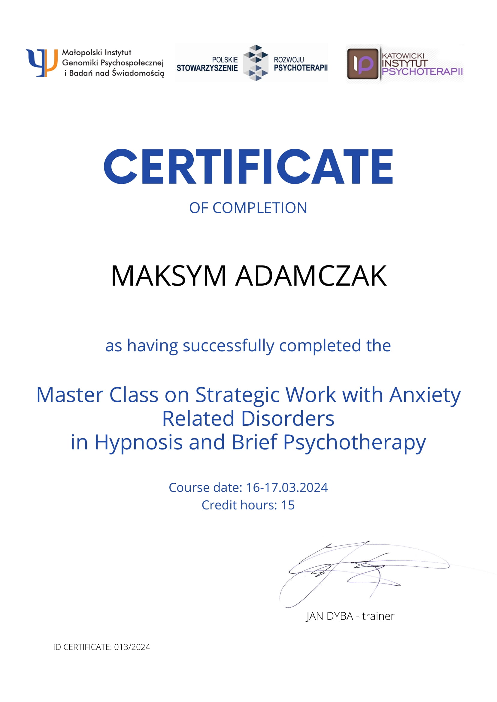 - „Master Class on Strategic Work with Anxiety Related Disorders in Hypnosis and Brief Psychotherapy” (15h), mgr Jan Dyba, Małopolski Instytut Genomiki Psychospołecznej i Badań nad Świadomością, 2024 r.