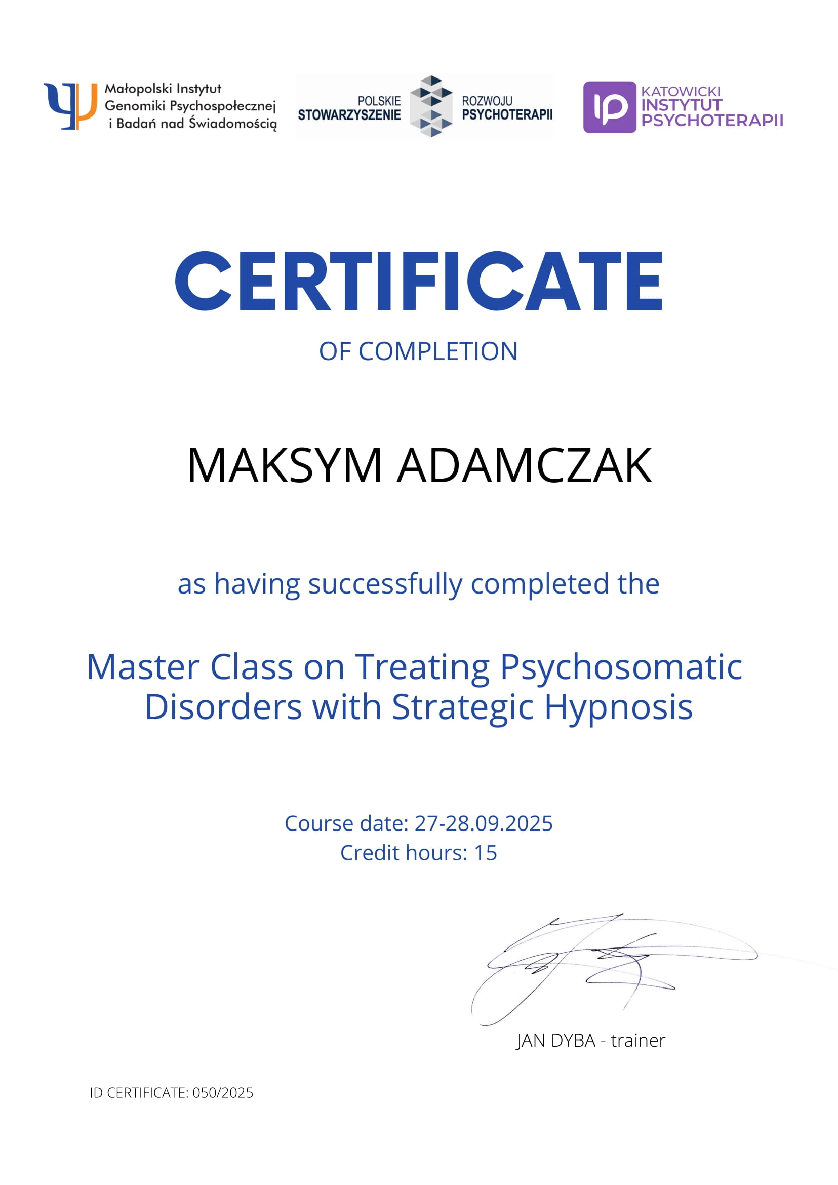 - „Master Class on Treating Psychosomatic Disorders with Strategic Hypnosis” (15h), mgr Jan Dyba, Małopolski Instytut Genomiki Psychospołecznej i Badań nad Świadomością, 2025 r.