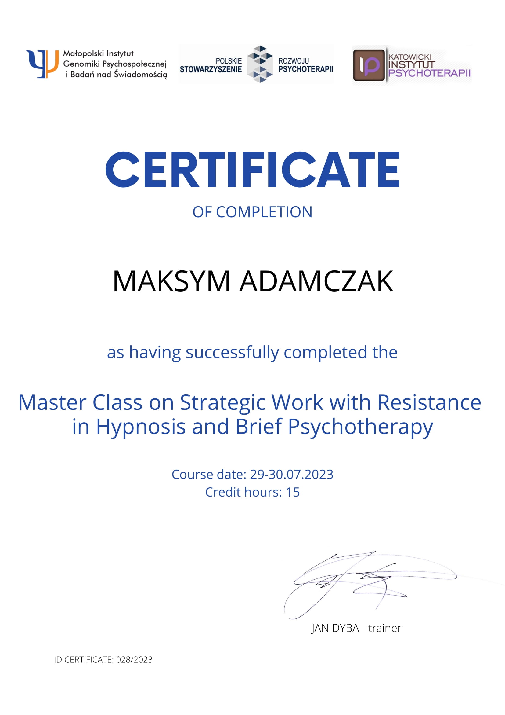 - „Master Class on Strategic Work with Resistance in Hypnosis and Brief Psychotherapy” (15h), mgr Jan Dyba, Małopolski Instytut Genomiki Psychospołecznej i Badań nad Świadomością, 2023 r.