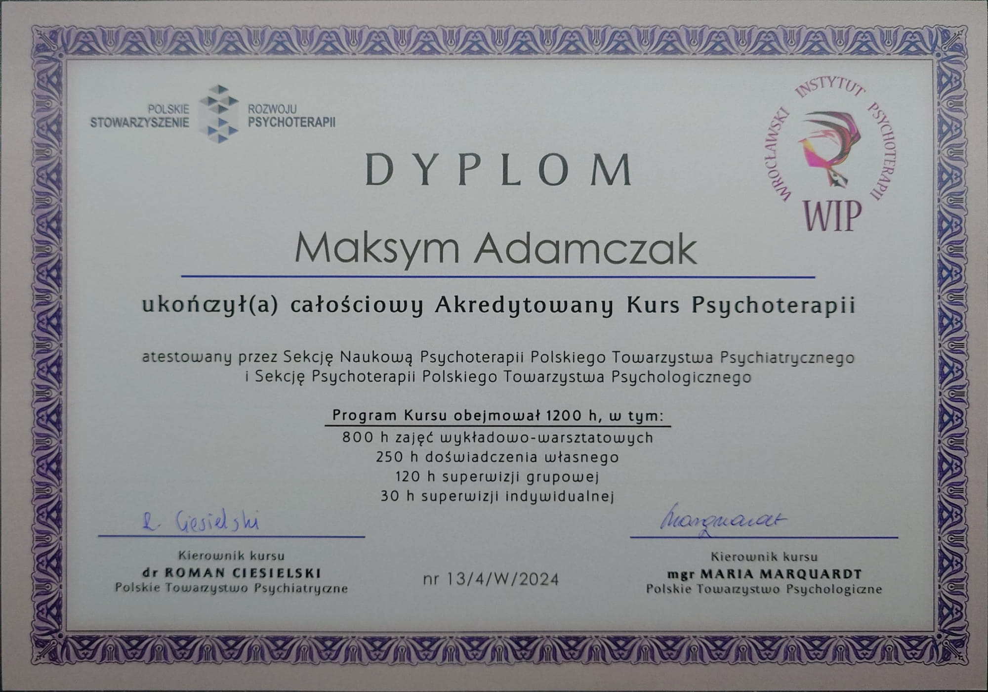 - 5-letni podyplomowy Kurs Psychoterapii w nurcie systemowo-ericksonowskim (1200h), Wrocławski Instytut Psychoterapii, 2024 r.