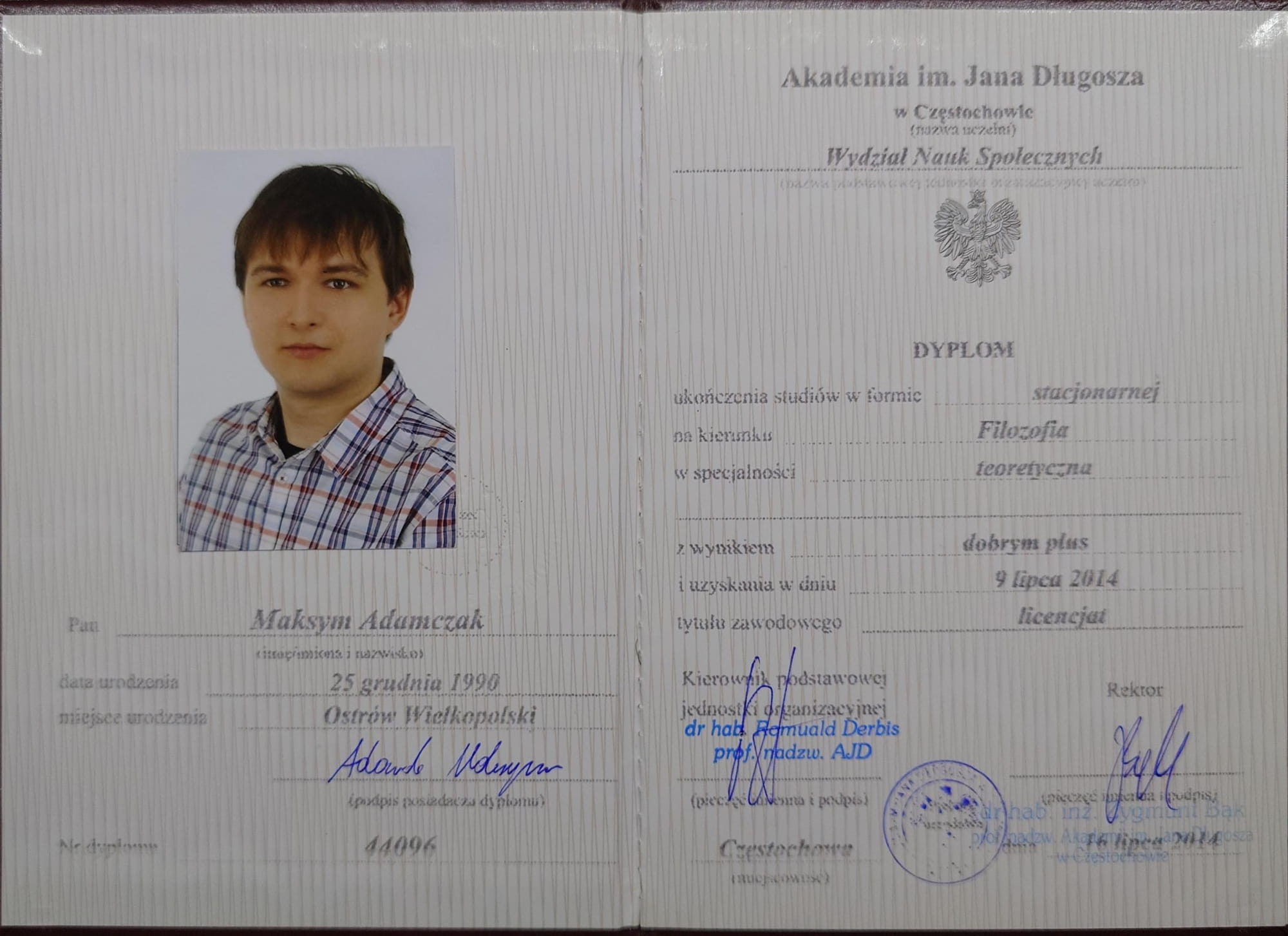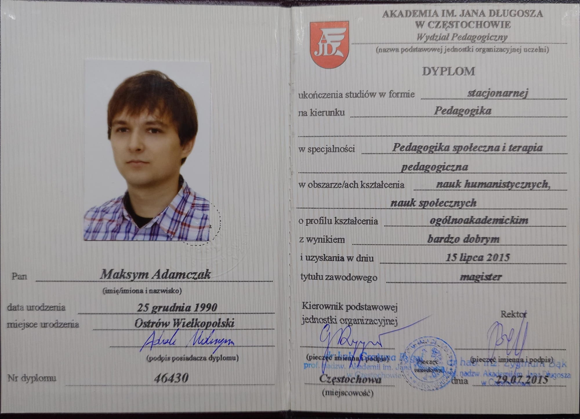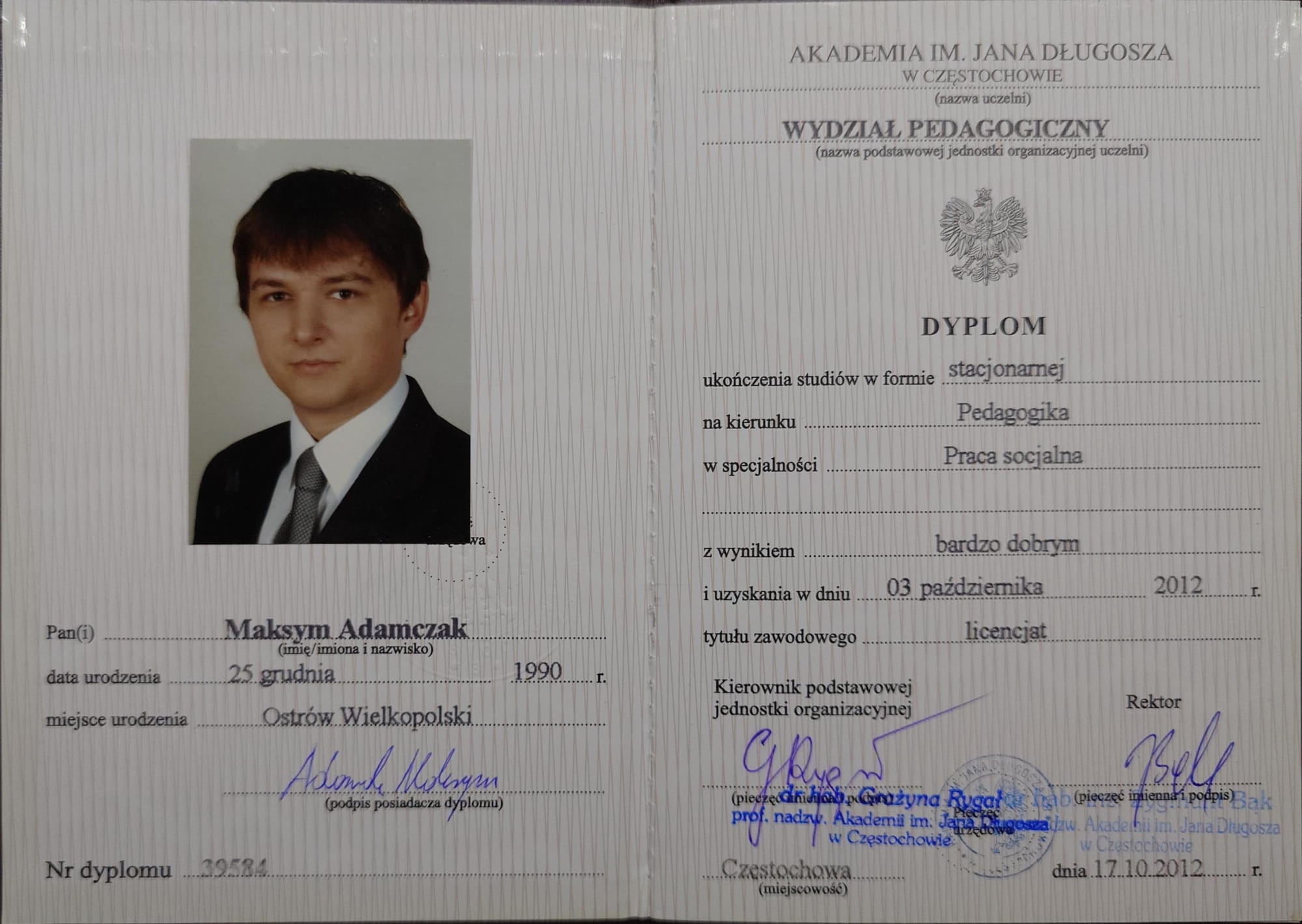Ukończyłem studia pedagogiczne o specjalizacji terapia pedagogiczna i pedagogika społeczna oraz specjalizację z pracy socjalnej.